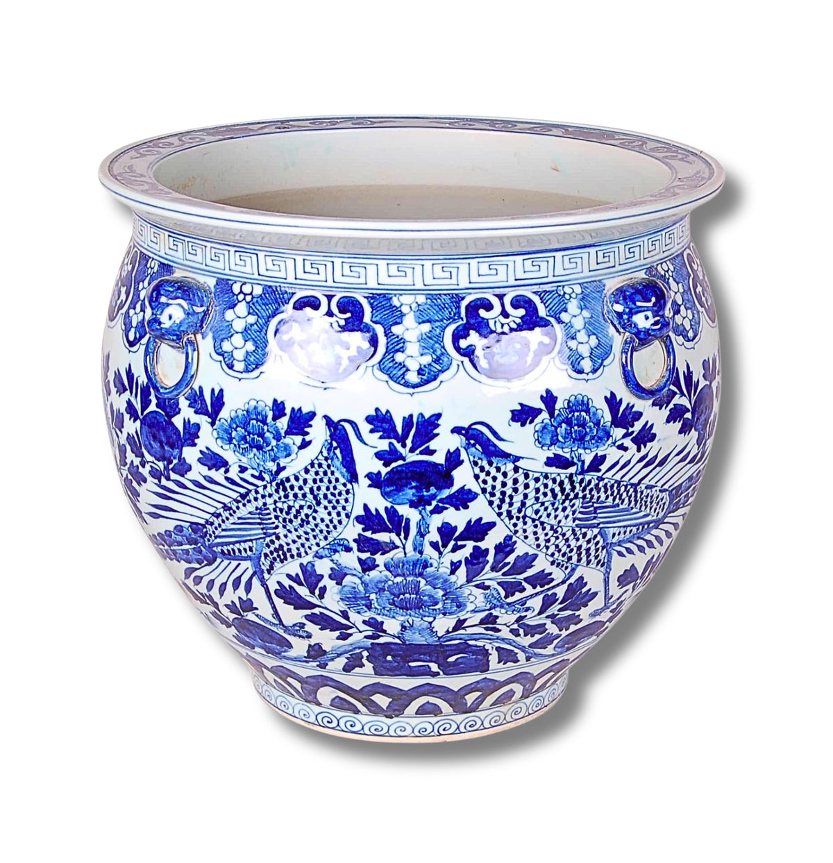 This reproduction porcelain fish bowl planter features a blue and white bird and flower design. It is sold individually due to the inability to make matching pairs. Handcrafted and hand-decorated, each piece may have slight variations and imperfections, adding to its unique character.