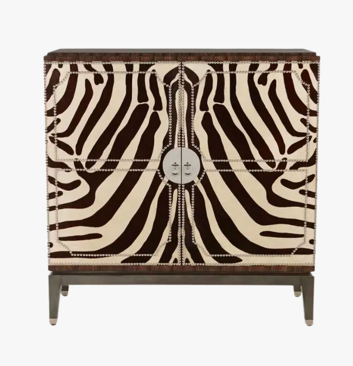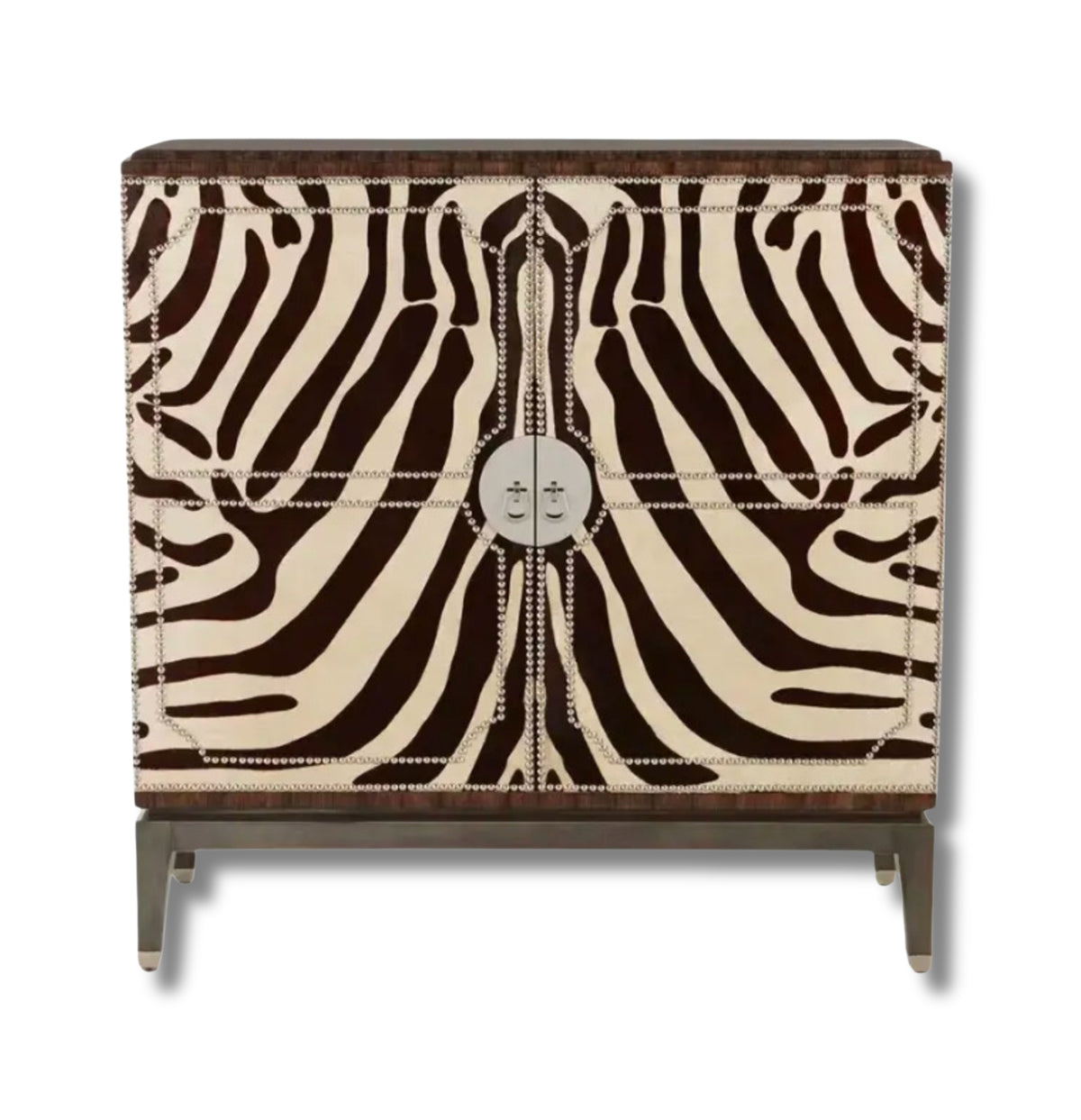 Expertly crafted from solid wood, the Sebastian foyer table boasts a stunning faux zebra skin design and elegant pewter nailheads. This console cabinet exudes a luxurious and sophisticated aura, making it the perfect addition to any grand entrance.