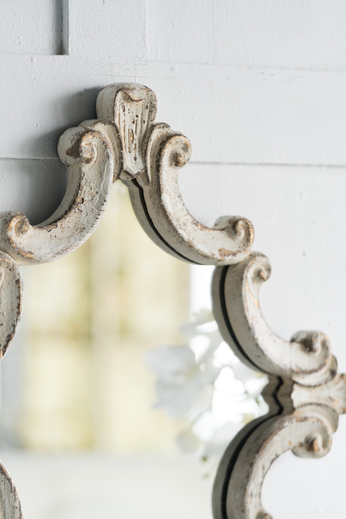 Combining elements of French country and vintage design, the Beau French Country Scrollwork Mirror exudes a majestic charm. Its diamond-shaped frame is adorned with delicate scrollwork, elevating its abstract aesthetic. Made of sturdy fir wood, this mirror is built to last and features a distressed white finish that effortlessly blends with any interior decor.