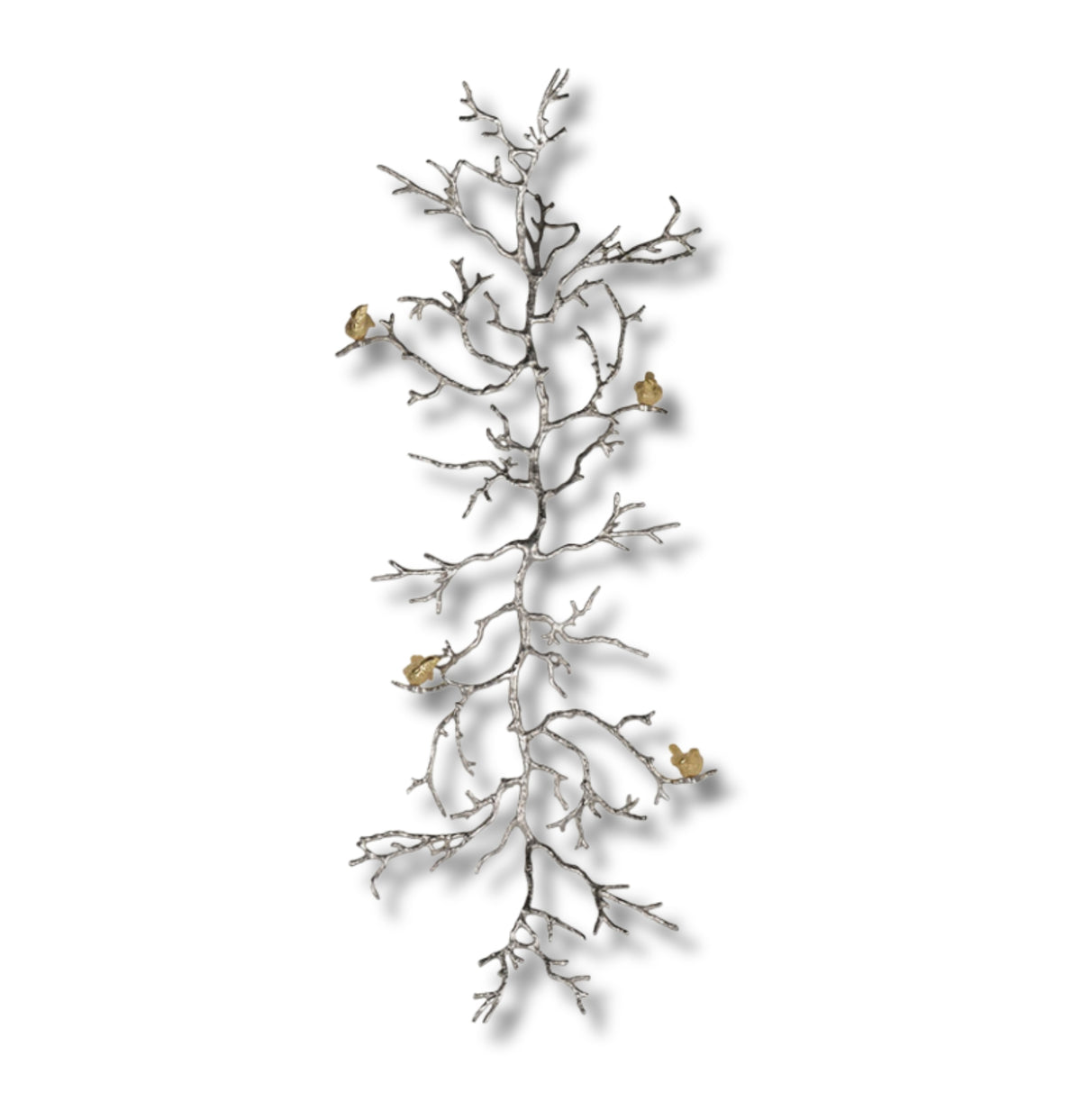 Introducing the Kiran Branch Wall Sculpture, a stunning addition to your wall. Its delicate silver branches with golden birds are sure to elevate your decor. This one-of-a-kind piece will captivate your guests and add a touch of elegance to any space.