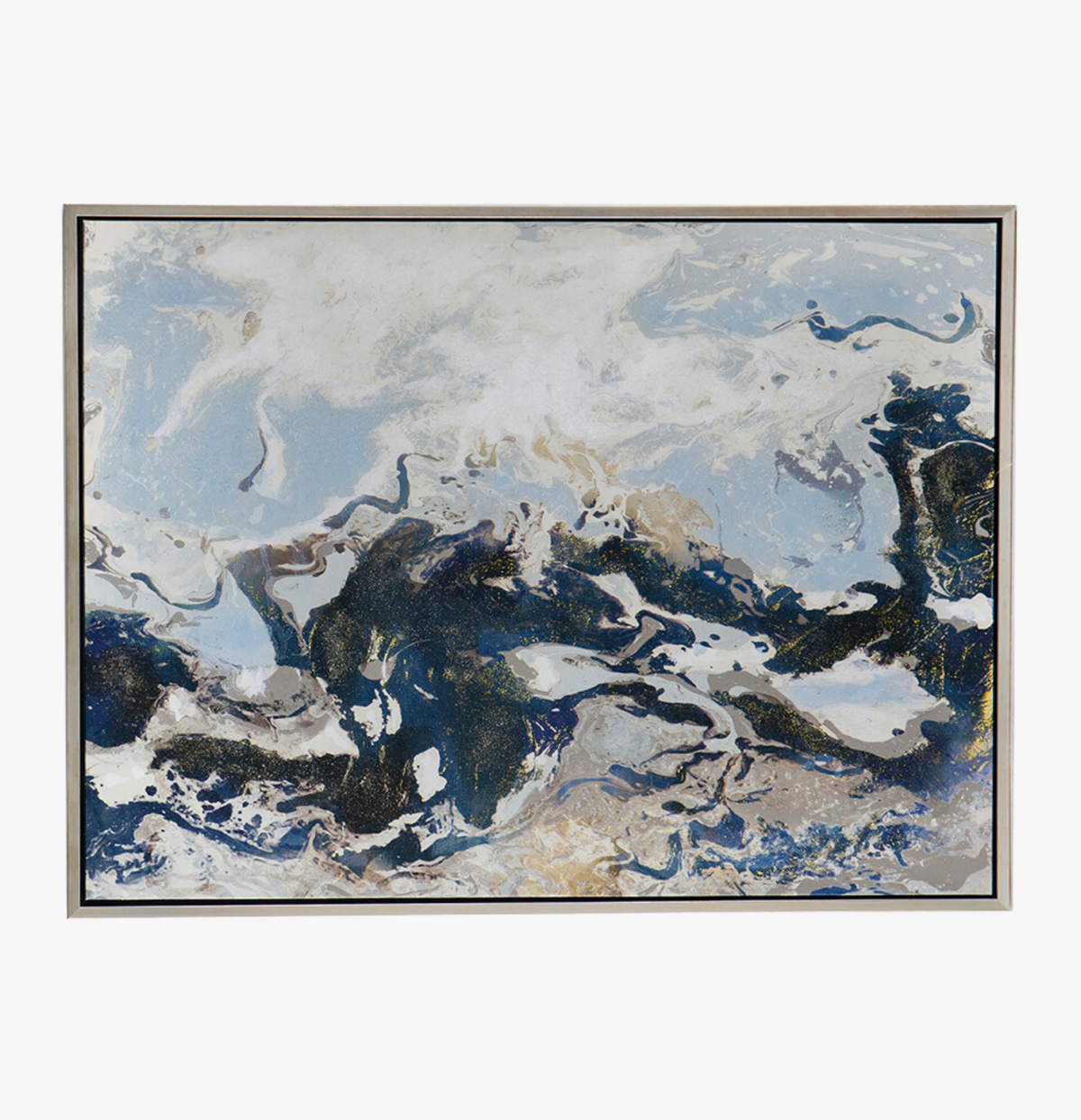Experience the beauty and serenity of the ocean with this mesmerizing painting. Abstract blues and shades of white capture the ever-changing nature of the water, while brushstrokes and blending techniques create a sense of motion. A minimalist frame complements the artwork without overpowering it. Take a piece of the sea with you in any space.