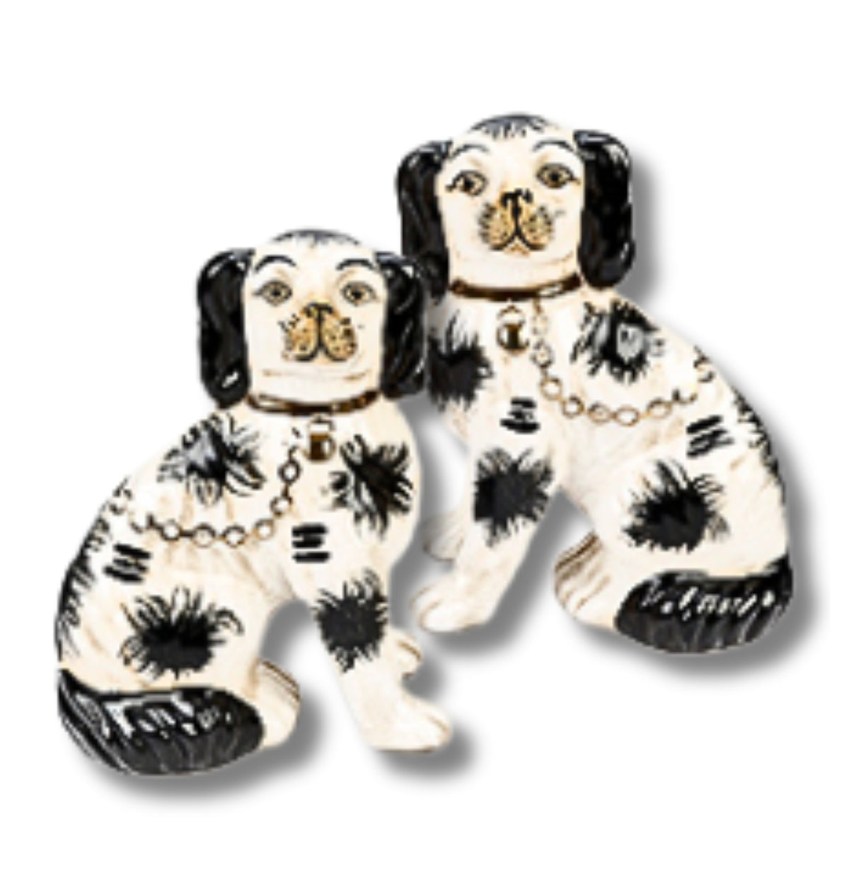 These exquisite Staffordshire Dogs showcase two playful, porcelain dogs in black, white and gold. The intricately designed pair capture their adorable personalities. Crafted from high-quality porcelain, this figurine is a must-have for Staffordshire Dog enthusiasts and collectors. Its stunning design and meticulous detail add a touch of charm to any space. The dogs' charming expressions and delicate features make this figurine a heartwarming accent to your home decor.