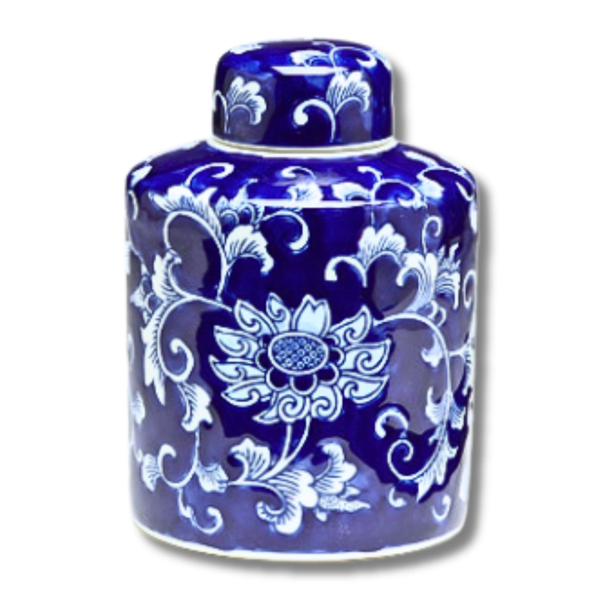 This expertly crafted cylindrical jar features a stunning blue floral design on durable porcelain material, making it ideal for both storage and decoration. The intricate floral pattern adds an elegant touch to any room and is sure to stand the test of time as a timeless addition to your home decor. The calming blue and white colors create a soothing atmosphere, making it a perfect fit for a bedroom or living room. Its unique cylindrical shape and eye-catching floral motif make it a standout piece.