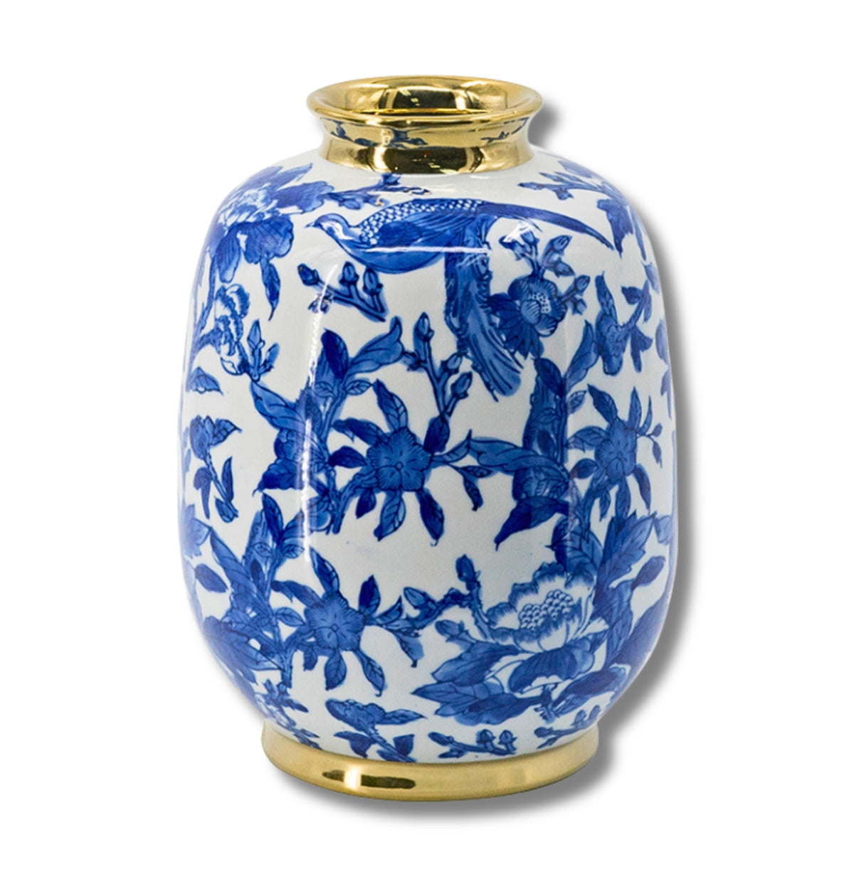 Crafted from high-quality porcelain, this stunning vase features a bold transitional design. The intricate blue flower and bird patterns, along with the vibrant gold trim, will add a fresh touch to any room. Its ideal size makes it perfect as a standalone centerpiece or paired with a custom assortment of flowers.