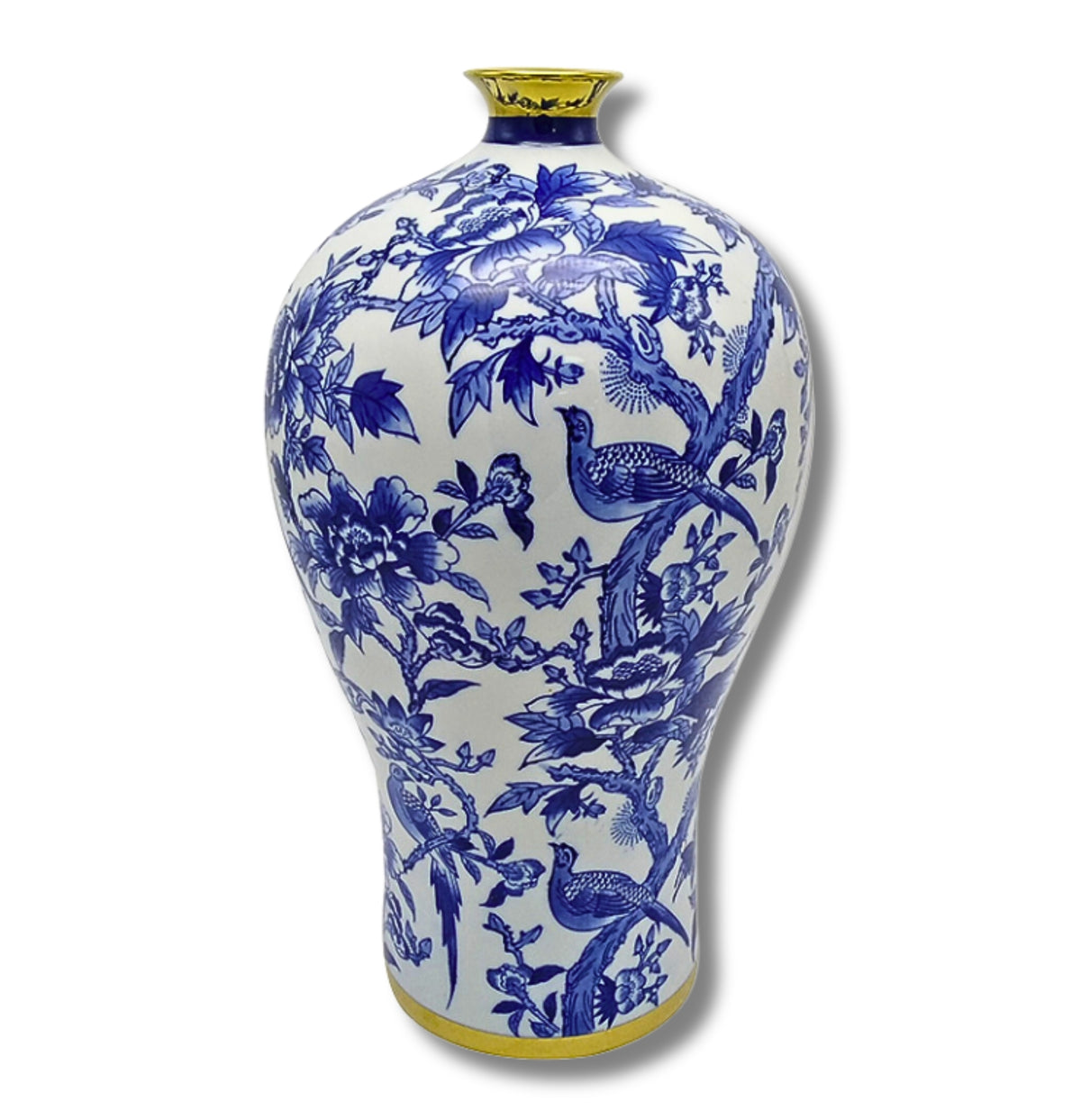 Crafted from high-quality porcelain, this exquisite vase showcases a stunning blend of blue floral and bird patterns. Its oversized curved shape and bright gold trim make it a captivating centerpiece for any room. Not only is it easy to clean and move, it is also incredibly durable, making it perfect as a standalone piece or paired with long-stemmed flowers.