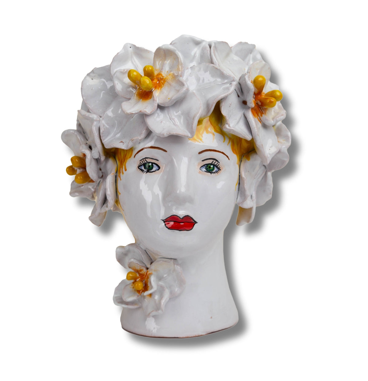 This ceramic head vase is a stunning piece of art, inspired by the authentic Tuscan tradition. Hand-painted with natural elements, it's a beautiful addition to any room. With its unique design, it's sure to be a conversation starter. The vase is a part of the Donatello Collection, which features 11 different hand-painted vases with various natural elements.