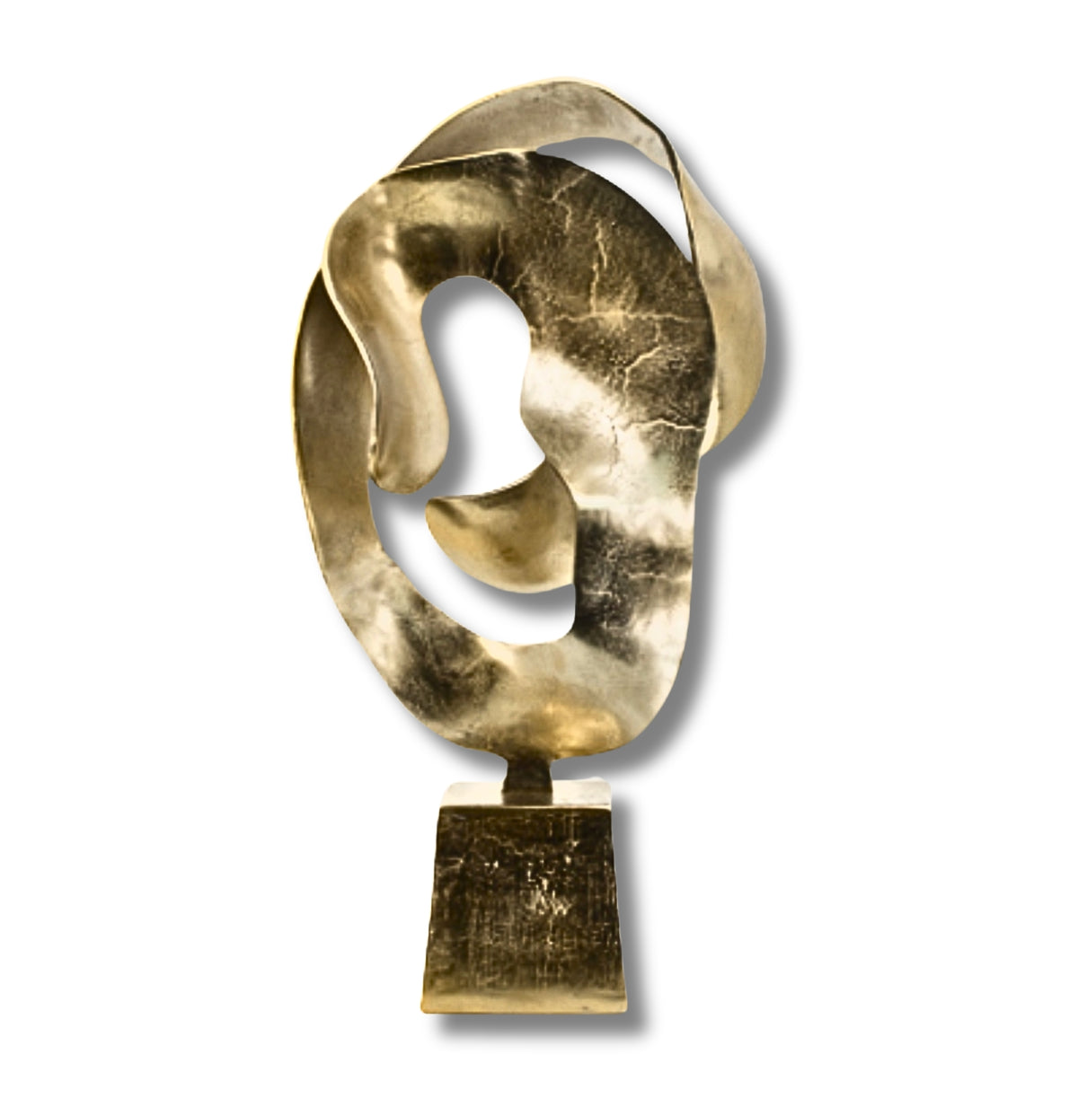 Add a modern and sophisticated touch to your space with this striking gold sculpture. Its fluid form and solid square base make it a versatile piece that can be displayed on a mantel, shelf, or tabletop. The gleaming gold tone and unique design add a burst of style to any room, making it suitable for modern, Art Deco, luxe, or eclectic themes. Made of durable aluminum, this sculpture adds a sense of elegance and poise to any setting while also serving as a conversation starter.