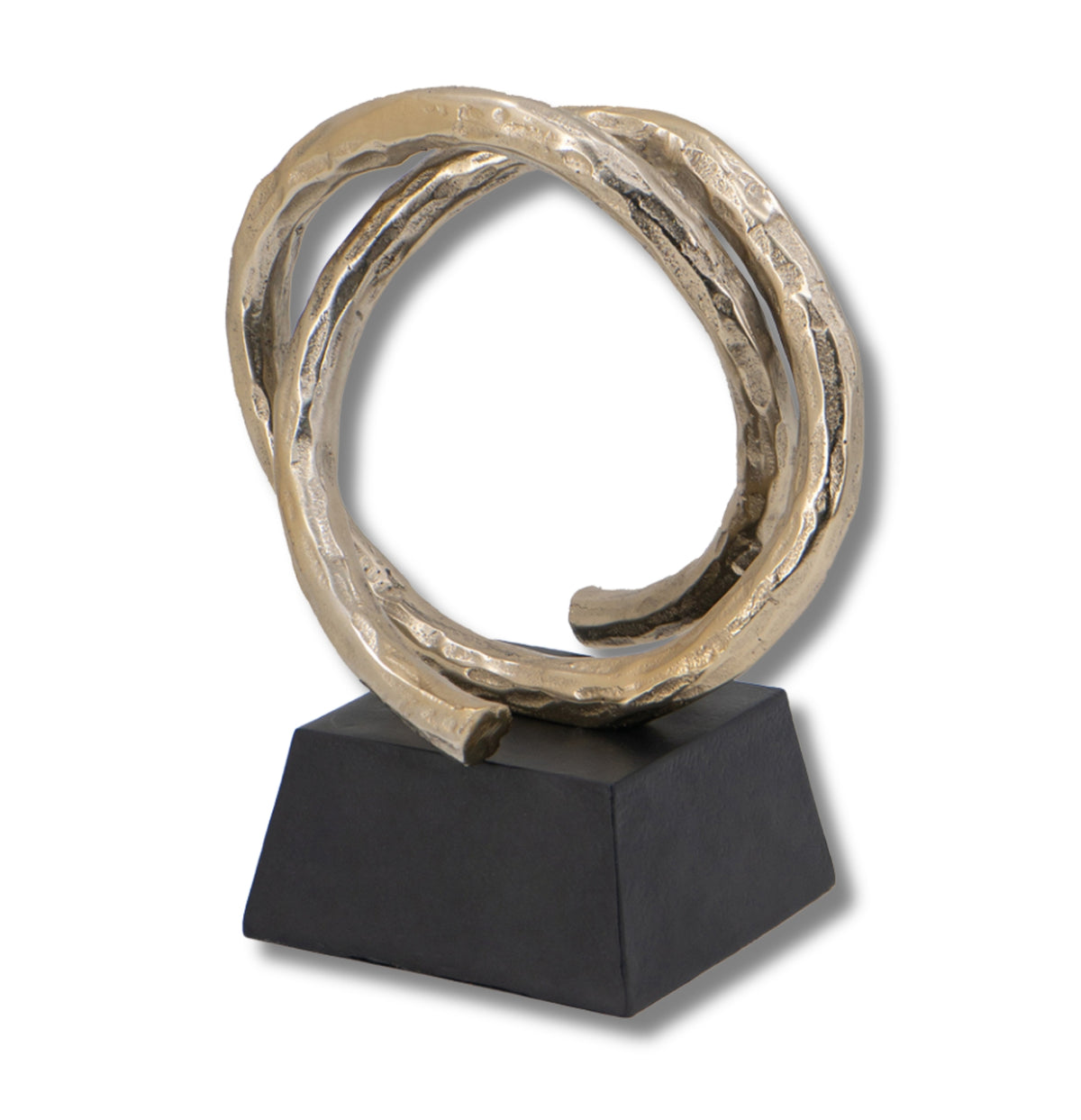 This exquisite sculpture showcases a golden loop atop a polished black base, making it a chic and compact addition to your home decor. Fabricated from premium-grade aluminum, it complements modern, Art Deco, traditional, and industrial settings effortlessly. The subtle contrast of colors and understated design give it the ability to elevate your current decor seamlessly. Display it on your desk, side table, or mantel to add a touch of refinement to your space. Its compact size makes it portable and allows for easy rearrangement, giving you the freedom to change up your decor at any time.