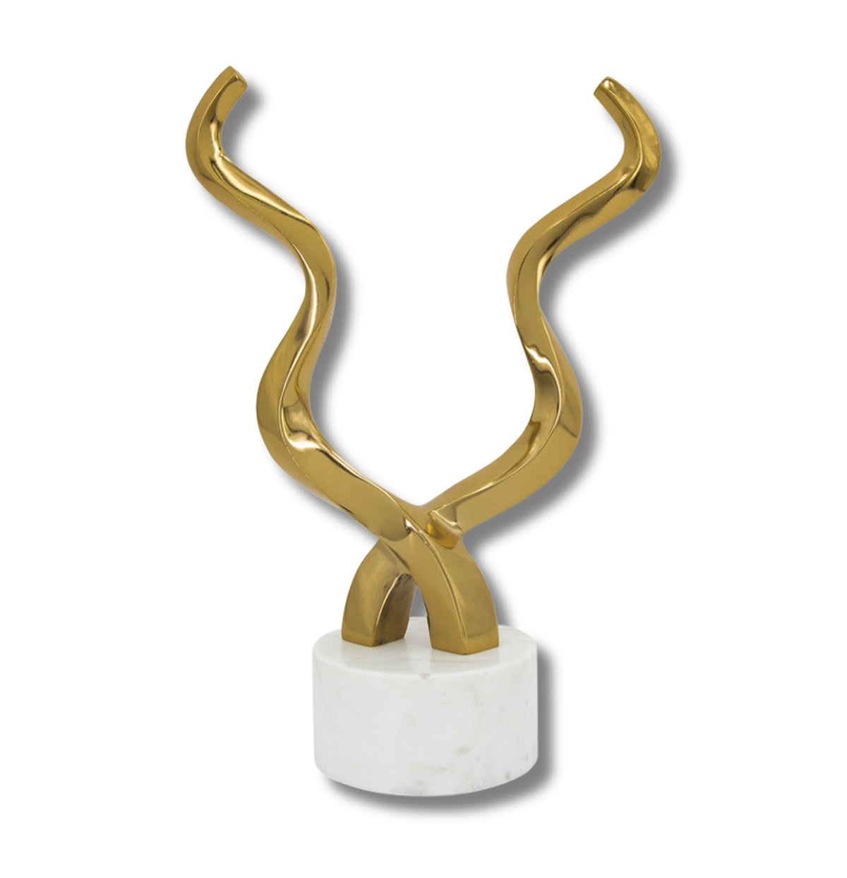 Enhance the ambiance of any room with this Grayson Gold & Marble Horn Sculpture. Its lavish gold finish exudes luxury, while the marble base adds a touch of refinement and stability. This unique sculpture is sure to be a conversation starter and captures the attention of any viewer. It's the perfect choice for those seeking a glamorous addition to their home decor, with its modern design and premium materials.