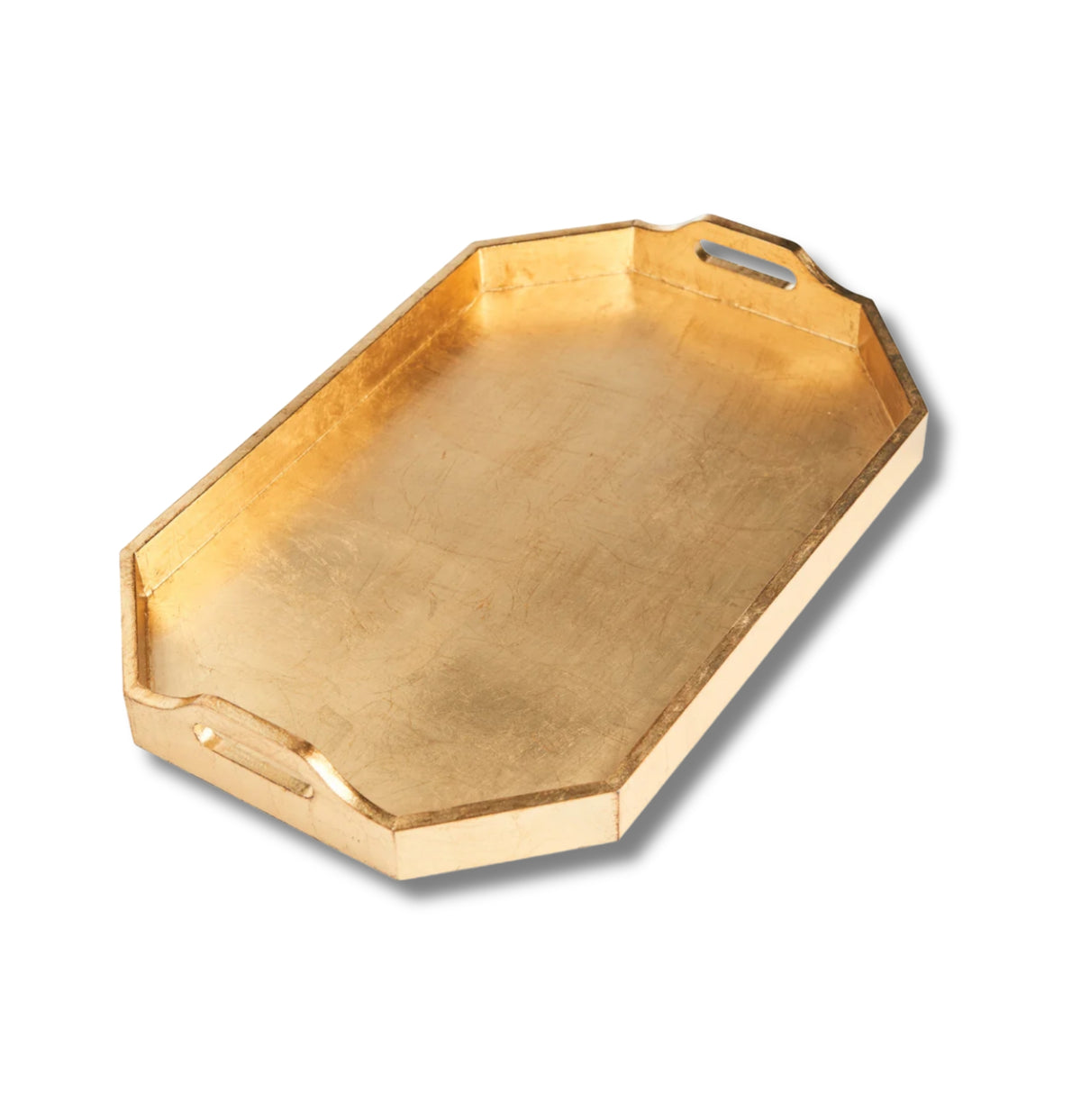 This sophisticated platter boasts a beautiful gold finish and timeless appeal. With practical handles for effortless transport, it is the perfect serving and hosting essential. The shimmering gold adds a luxurious touch, while the rectangular shape provides ample space for various dishes, appetizers, or desserts. It is an exquisite addition to any home decor and its durable construction ensures its lasting use.