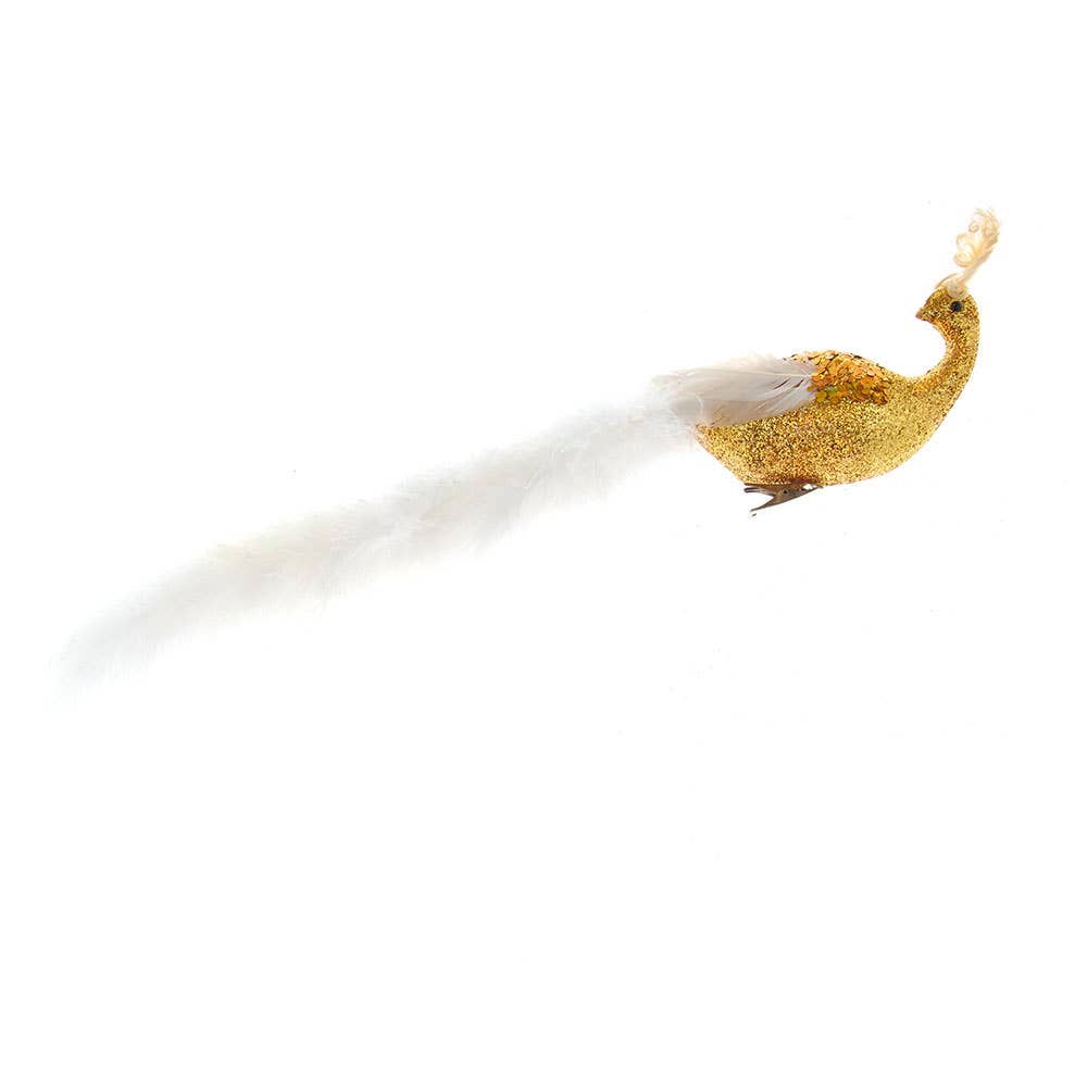 This exquisite 18" Christmas ornament displays a Gold Phoenix adorned with White Feathers and can be attached using a metallic clip.
