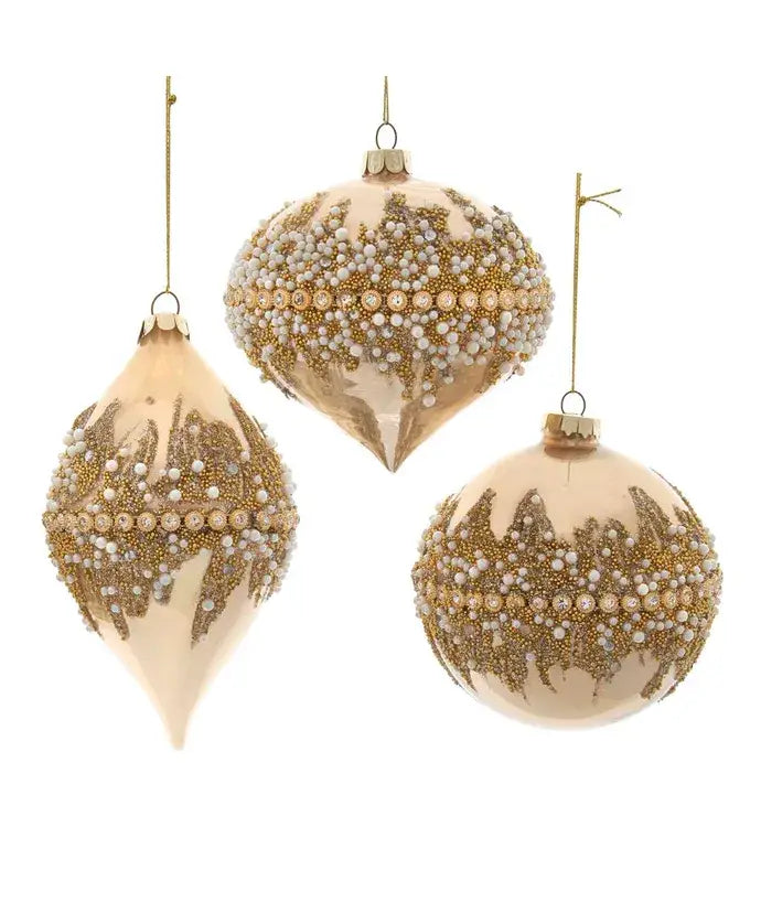 The Celia Jewel Ball Ornaments are a stunning addition to your holiday décor or Christmas tree. Each ornament in this beautiful assortment is beautifully decorated with an intricate gold pattern detailed with white and gold mica and gold jewels.
