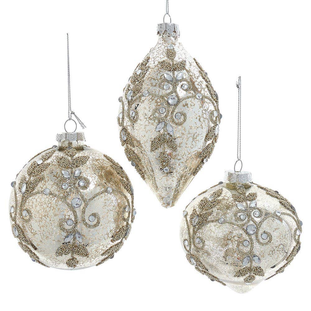 Enhance your holiday decor with the James Mercury Glass Ball, Drop & Onion Ornaments. This set of six 4" ornaments showcases exquisite mercury glass craftsmanship and features three timeless shapes - ball, drop, and onion. Each ornament is adorned with sparkling gemstones, adding a touch of vintage elegance and festive glow to your Christmas tree. Perfect for elevating the sophistication of your holiday display, these ornaments capture the luxurious charm of the season.