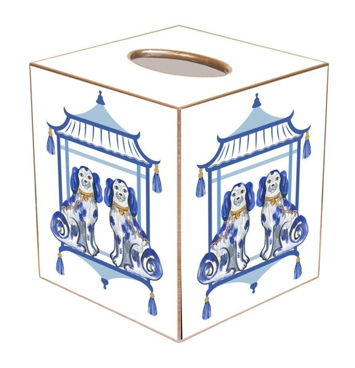 This Imogene Staffordshire Chic Blue Tissue Box Cover is carefully handcrafted and custom-made to fit any standard cubed tissue box. The artwork is expertly cut, decoupaged, and polished, while the edges are finished with a delicate hand-painted gold or silver detail.