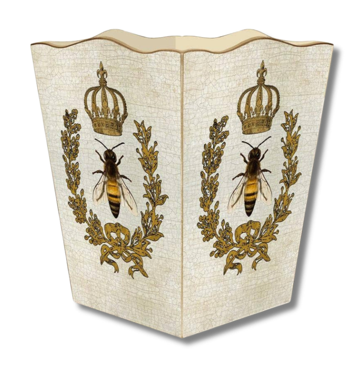 Constructed from wood and adorned with hand-cut, decoupaged artwork, our wastepaper baskets are meticulously polished by our skilled artisans. Adding a touch of elegance, each basket is delicately painted in either gold or silver along the edges.