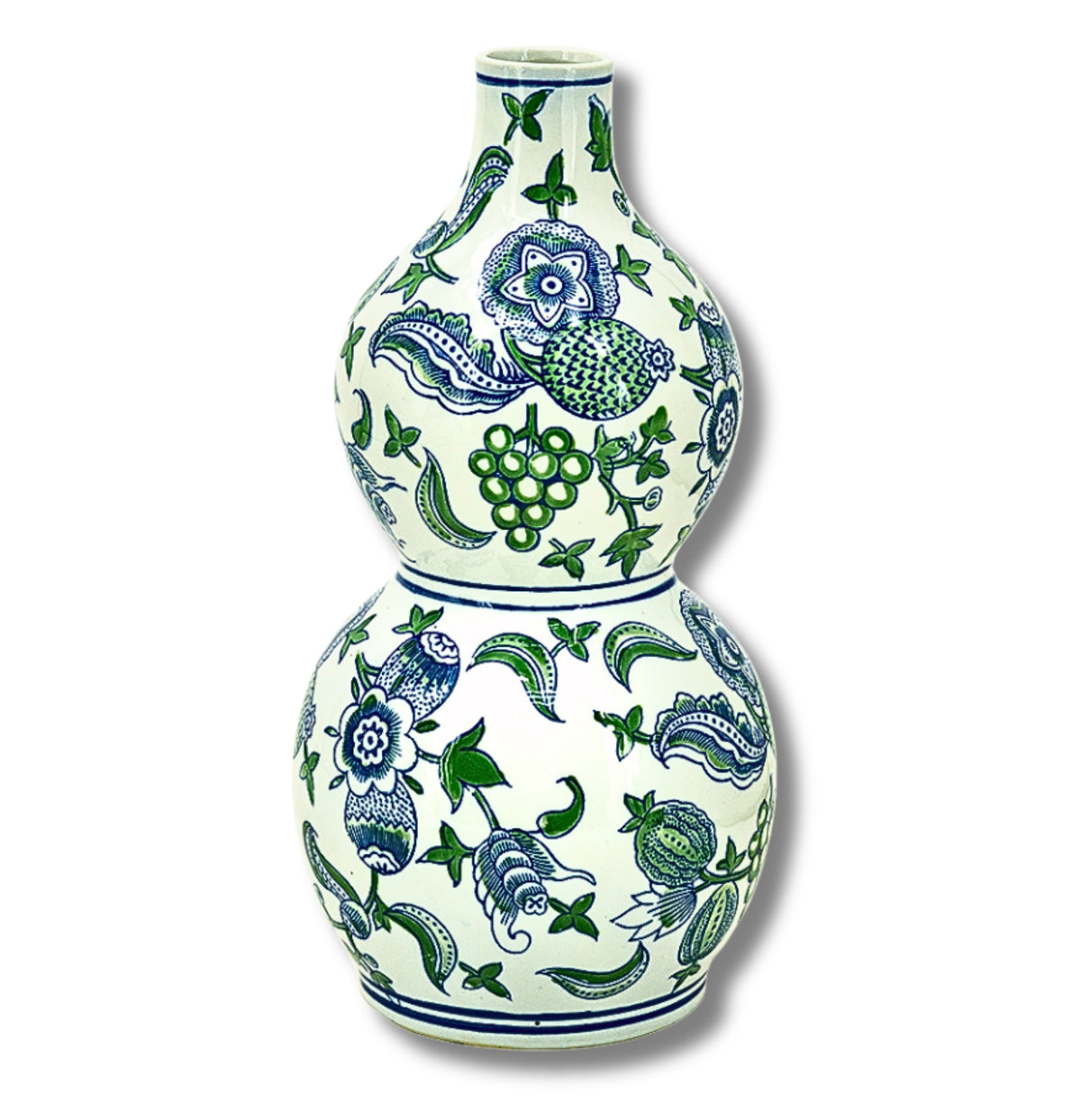 Crafted from 100% porcelain, the Allison Double Gourd Vase embodies elegance and sophistication, reminiscent of China's Ming Dynasty. With its iconic double gourd shape and striking blue and green cherry blossom motifs, this vase stands at 13.5 inches tall and 7 inches wide, making it a captivating centerpiece for any mantel, dresser, sideboard, or tabletop.