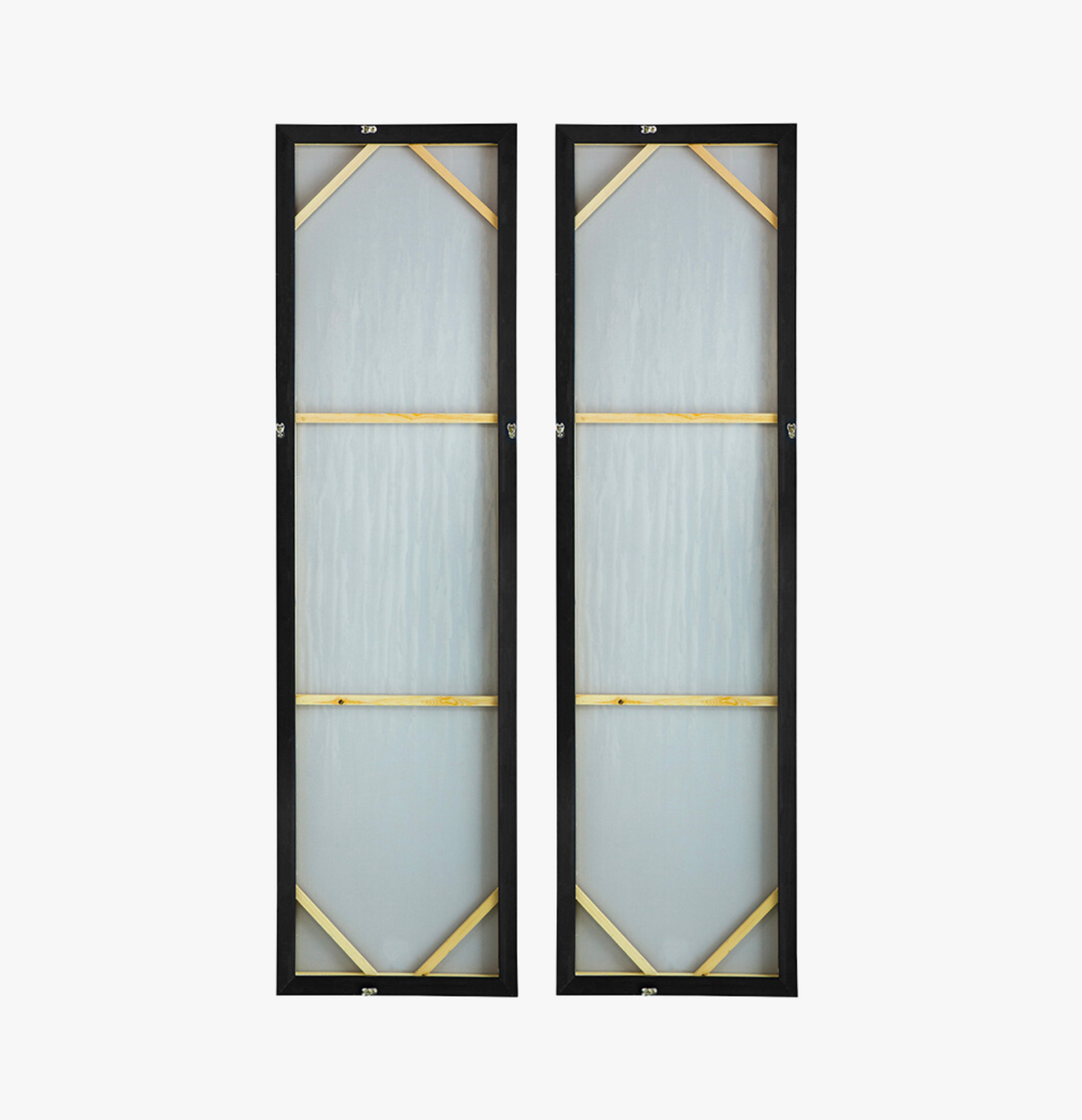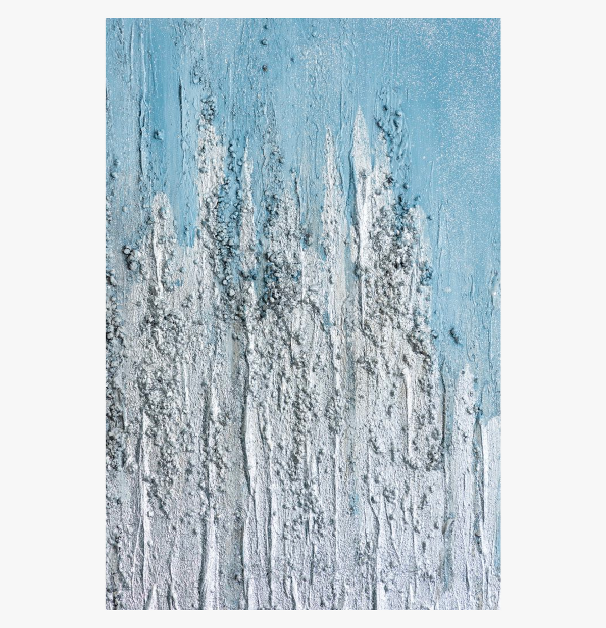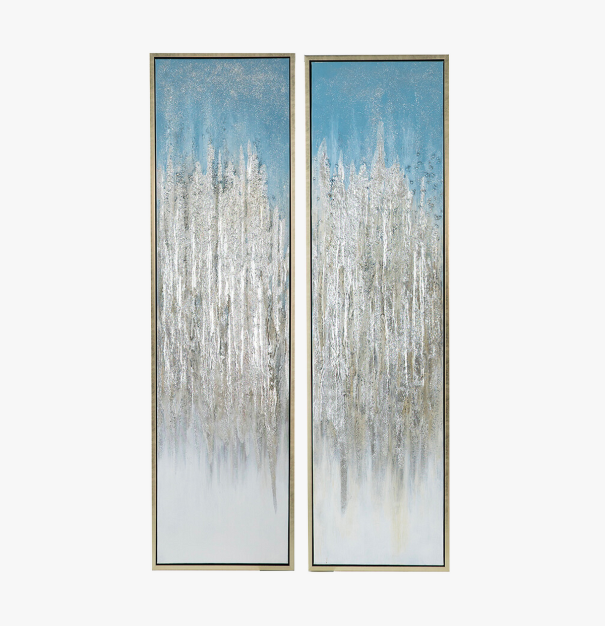 This stunning collection of two ombre paintings features blue, white, and silver hues seamlessly blending together, skillfully rendered with oil paints. The gradual transition between colors adds depth and the silver accents bring a touch of modern sophistication. These paintings are ideally displayed together, with minimalistic or modern frames enhancing their visual impact. Overall, this set embodies tranquility, elegance, and modernity through its mesmerizing visual experience.