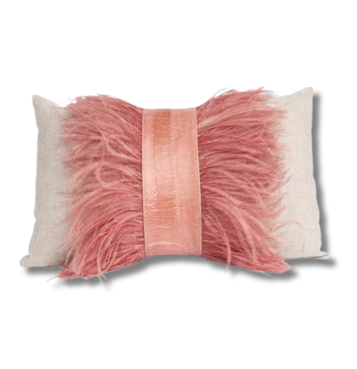 This luxurious linen pillow boasts expert hand-stitching, creating a unique texture and style for any room. It showcases a striking band made of ostrich shin leather and plush ostrich feathers, resulting in a one-of-a-kind blend of natural materials. Sustainably sourced from top suppliers in South Africa, the ostrich leather ensures a high-quality and eco-friendly product. With its exquisite design and lavish materials, this pillow is a must-have for any space, sure to start a conversation.