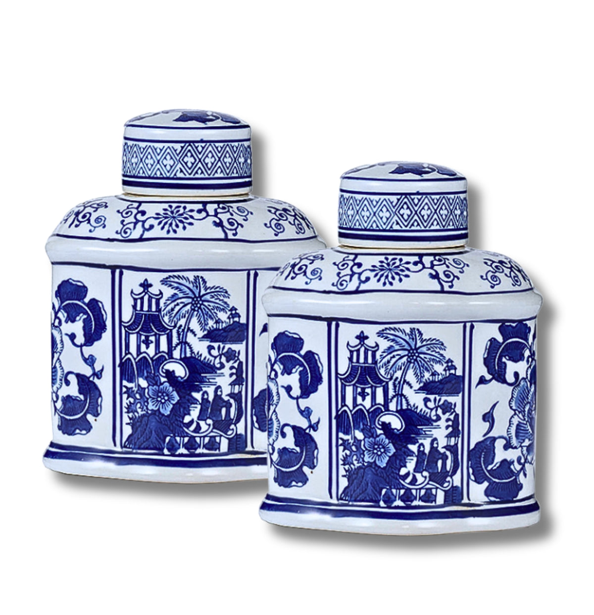 These oval jars evoke the aesthetic of Ming dynasty porcelain, infusing a sense of classic refinement into any tabletop or countertop display. The sleek white surface features charming blue depictions of charming florals and other whimsical patterns. Crafted from 100% porcelain, these jars are ideal for incorporating timeless elegance into your interior design.