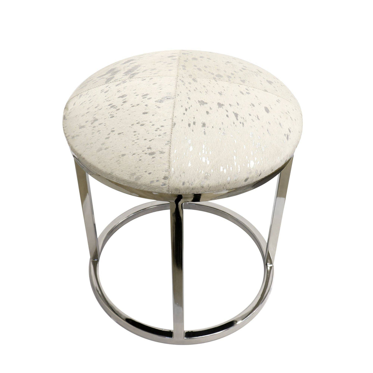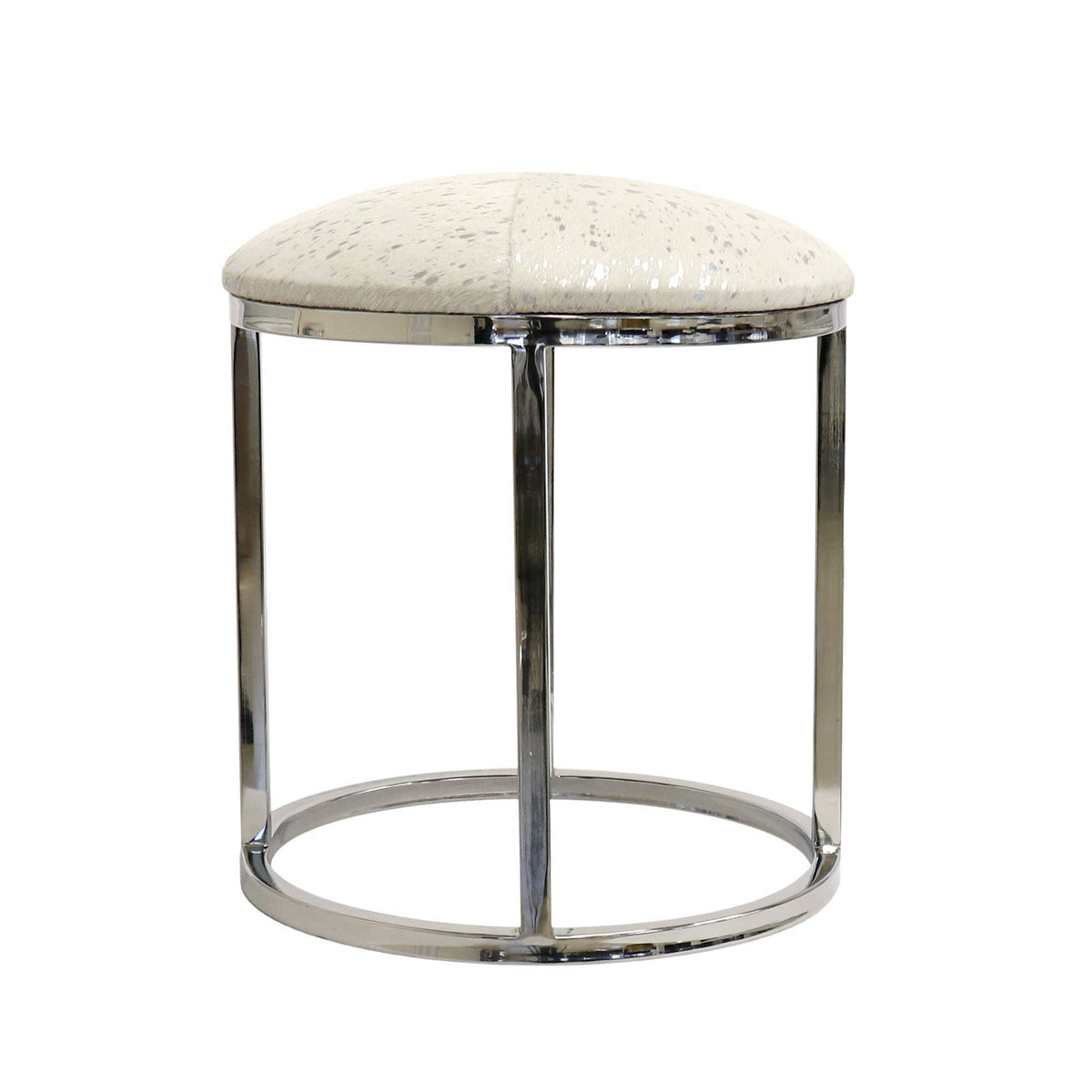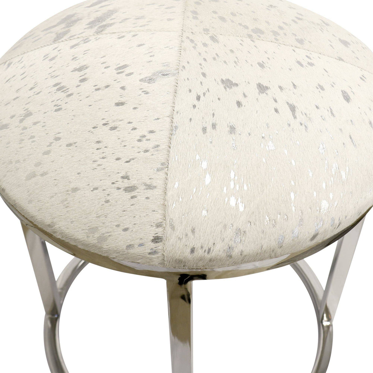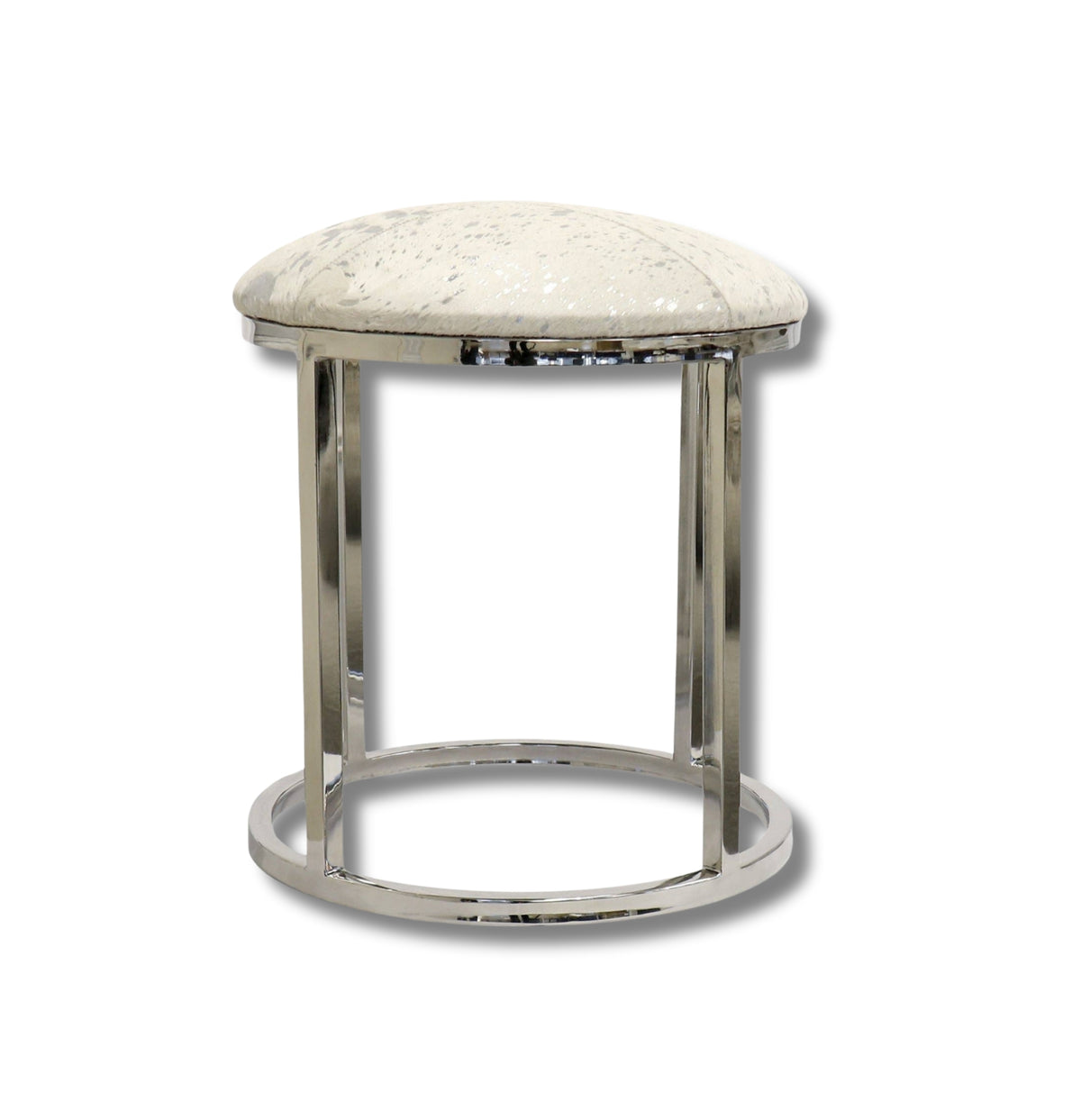 Discover luxury with the Sacha Safari Cowhide Stool. Adorned with unique cowhide patterns and sleek metallic accents, this modern piece elevates any room. Add a touch of sophistication to your living space with this luxurious stool.