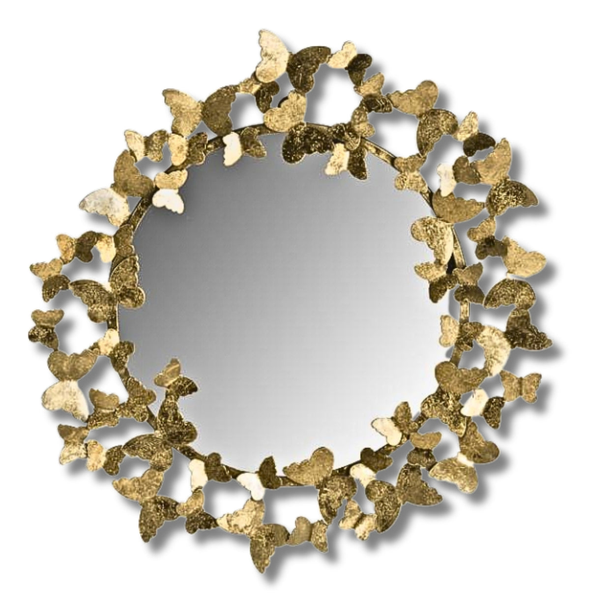 Enhance the beauty of your space with the Ruthie Lee Wall Mirror. Its elegant circular design, adorned with golden butterflies forged on iron, adds a touch of luxury to any room. Make a statement with this stunning piece.