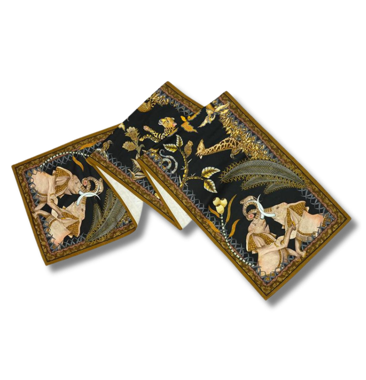Enhance your table setup with our bold Sabie Forest table runner, showcasing a dazzling golden pattern. Crafted from premium satin weave cotton, this runner boasts both exquisite appearance and strong durability. The luxurious texture lends itself perfectly for both formal gatherings and everyday meals. Inspired by the vibrant flora and hidden wildlife of the African jungle, the Sarie Forest design adds an adventurous touch to your dining ambiance.