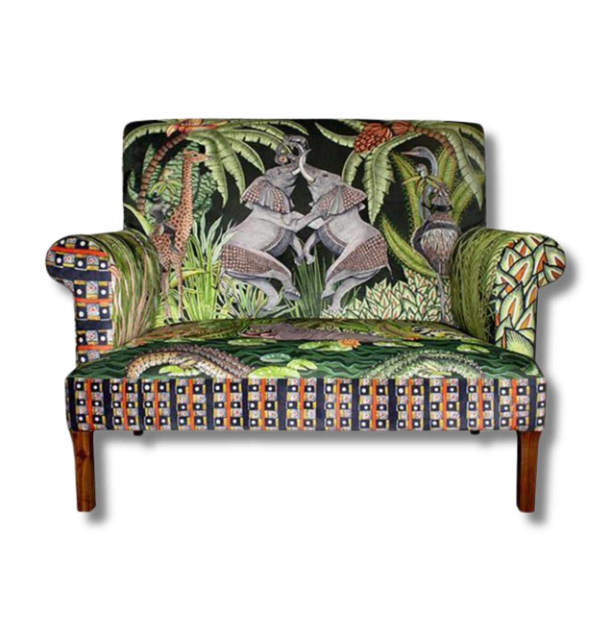 This Tristan Velvet Sofa is a one-of-a-kind masterpiece that showcases a tall back adorned with dancing elephants, giraffes, and ostriches. The border of the sofa is accented with a striped Zulu beaded pattern, providing a distinct touch. Limited to just 30 numbered pieces, this sofa is truly a work of art. Its depiction of vibrant animals and botanical elements creates a whimsical, fantasy-like atmosphere. Not only is the design visually striking, but it also offers a rich narrative of African culture and wildlife.