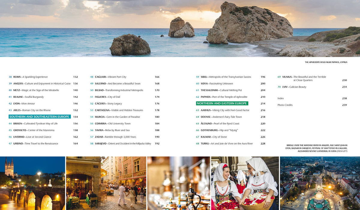 Lush photos and informative text bring to life cities like Salerno, Italy, with its medieval Old Town; Paphos, Cyprus, with its romantic beaches; Alkmaar, Holland, with its cozy cafes; or the flourishing port city of Turku in Finland. Divided by region—central Europe, western Europe, southern and southeastern Europe, and north and eastern Europe.