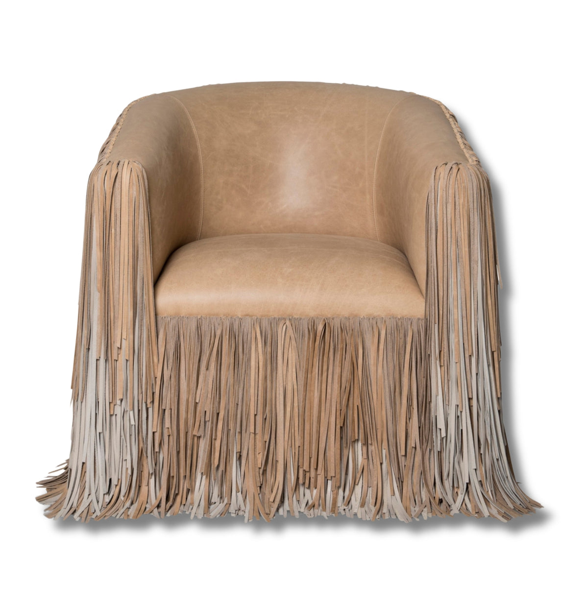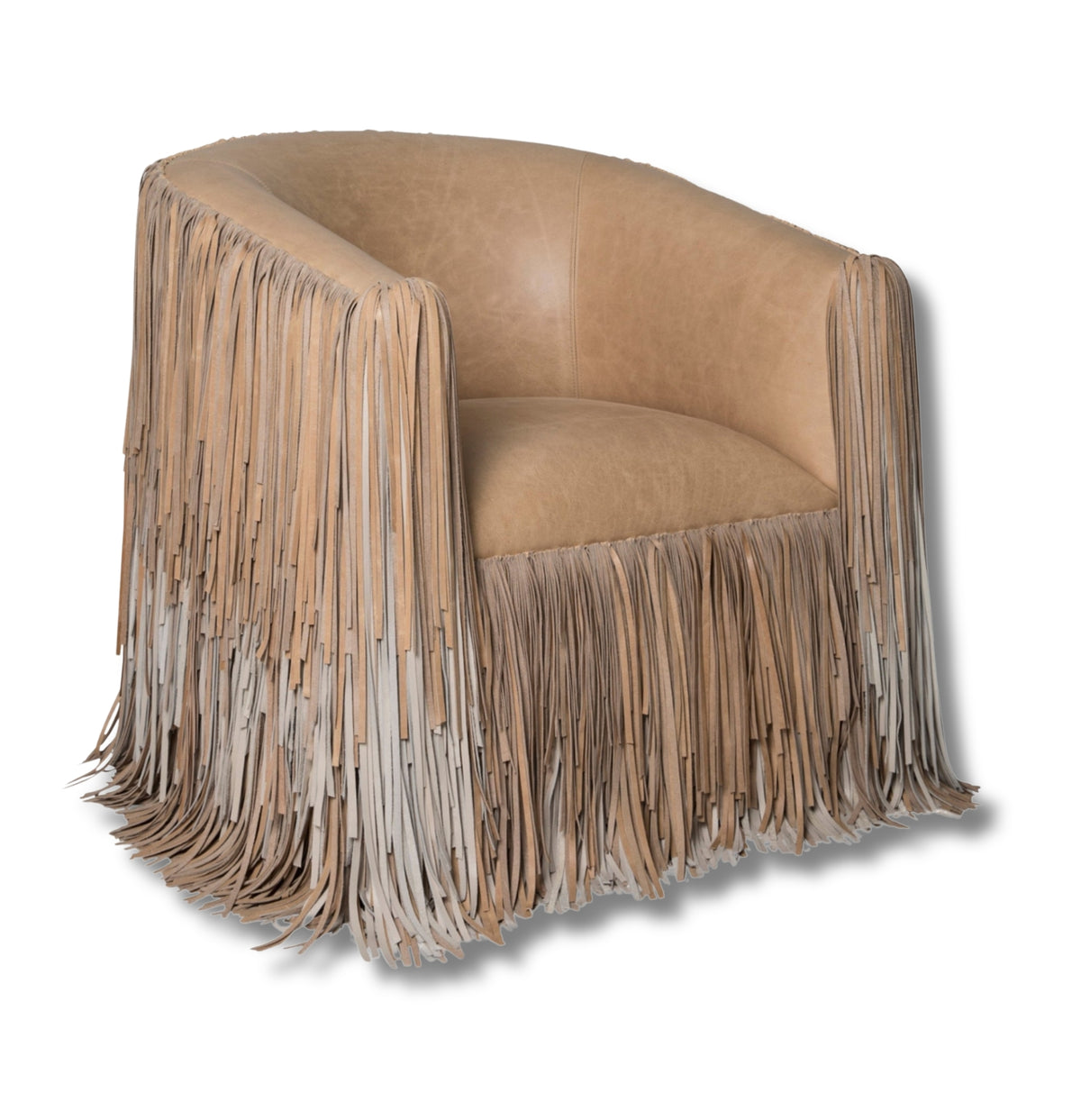 Crafted with hand-stripped leather, the Shaggy Leather Swivel Chair exudes a sense of timeless elegance with a hint of bohemian charm. Luxurious long fringe pieces adorn the exterior, adding a touch of uniqueness and style. Available in fifteen different leather shades, this versatile chair complements any room and design aesthetic, from contemporary to rustic. Whether used as a bold focal point or paired with other patterns and textures, this chair makes a statement in any space.