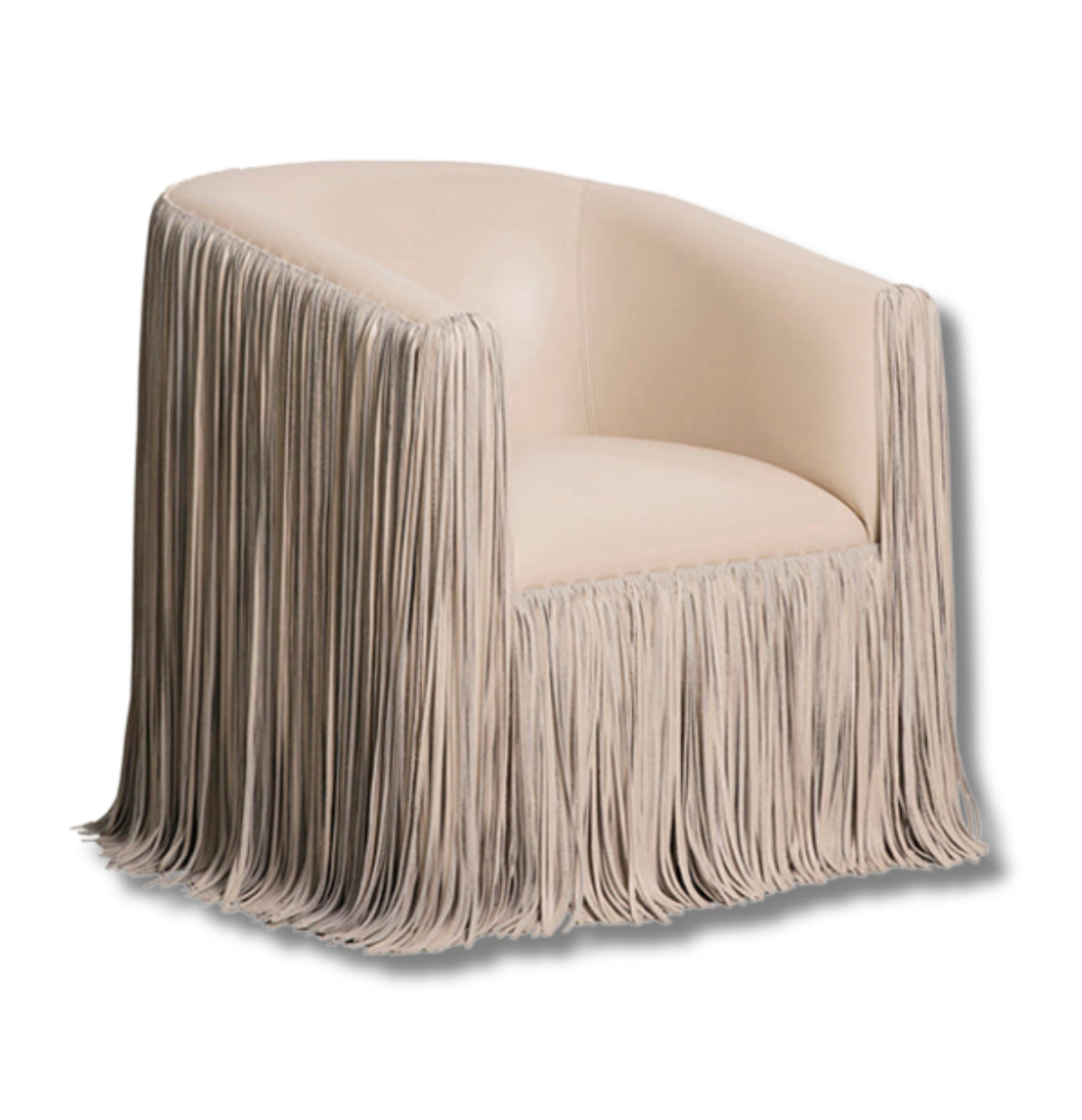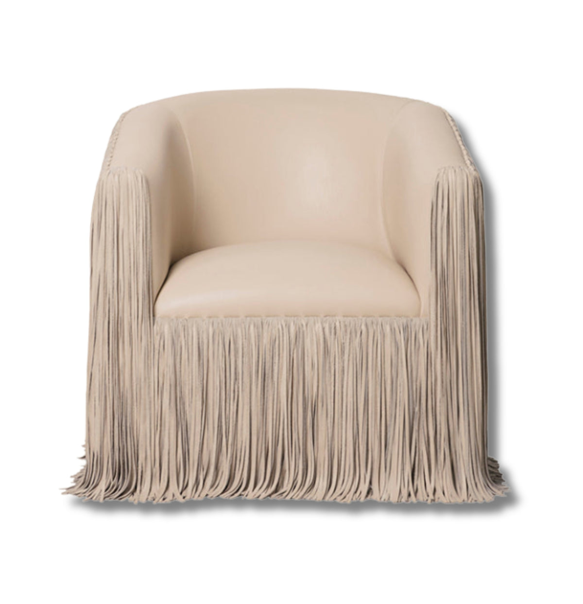 This shaggy leather swivel chair has a bohemian-inspired design with hand-stripped leather and long fringe pieces cascading from its exterior. Its luxurious appearance and touch of flair make it a perfect addition to any room, whether modern or rustic. The meticulously upholstered leather requires five full hides, ensuring each piece is unique and of high quality. Add this statement piece to your living room or create a cozy reading nook, either way, it's sure to impress with its superior materials and craftsmanship that will withstand the test of time.