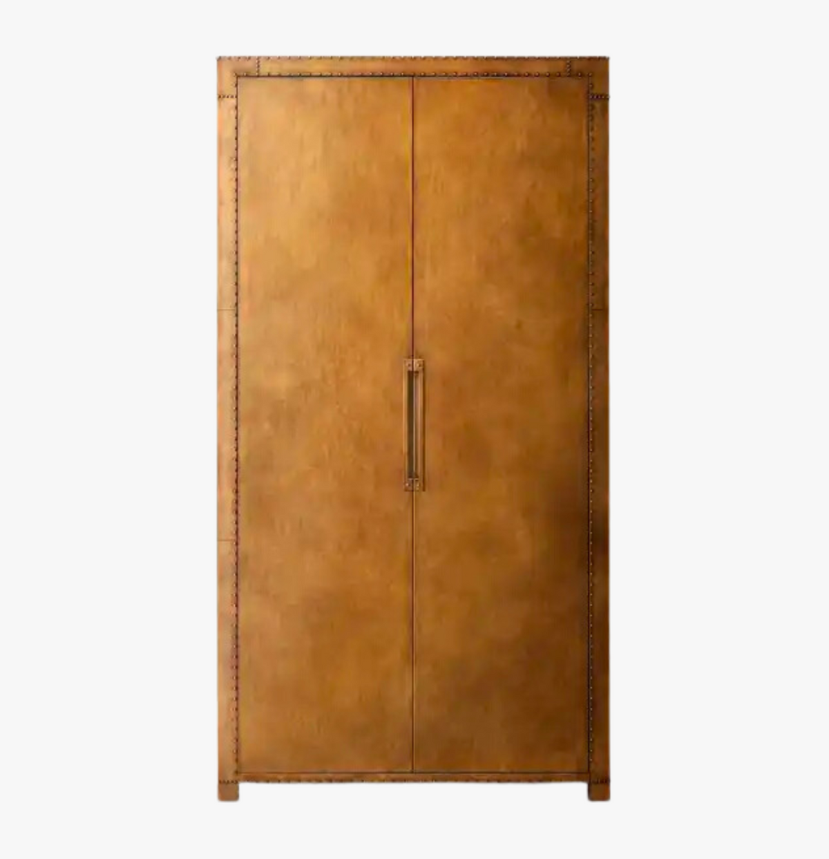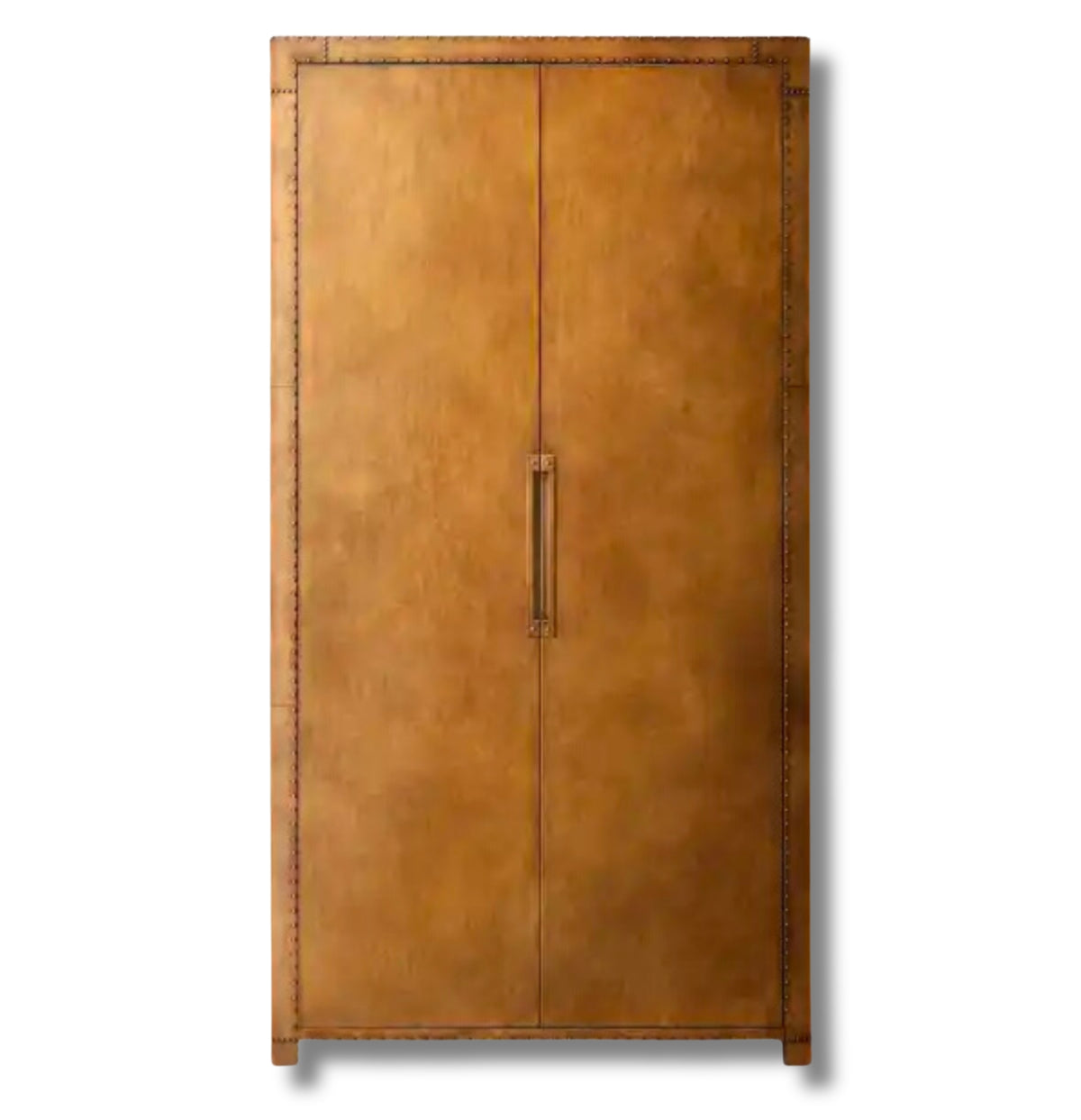 Crafted with precision, the Jameson Wardrobe Cabinet is an exemplary brass and rivet masterpiece. Versatility makes this piece ideal for use as a wardrobe, china cabinet, guest closet, or coat closet. It contains two adjustable shelves and a hanging rod inside.