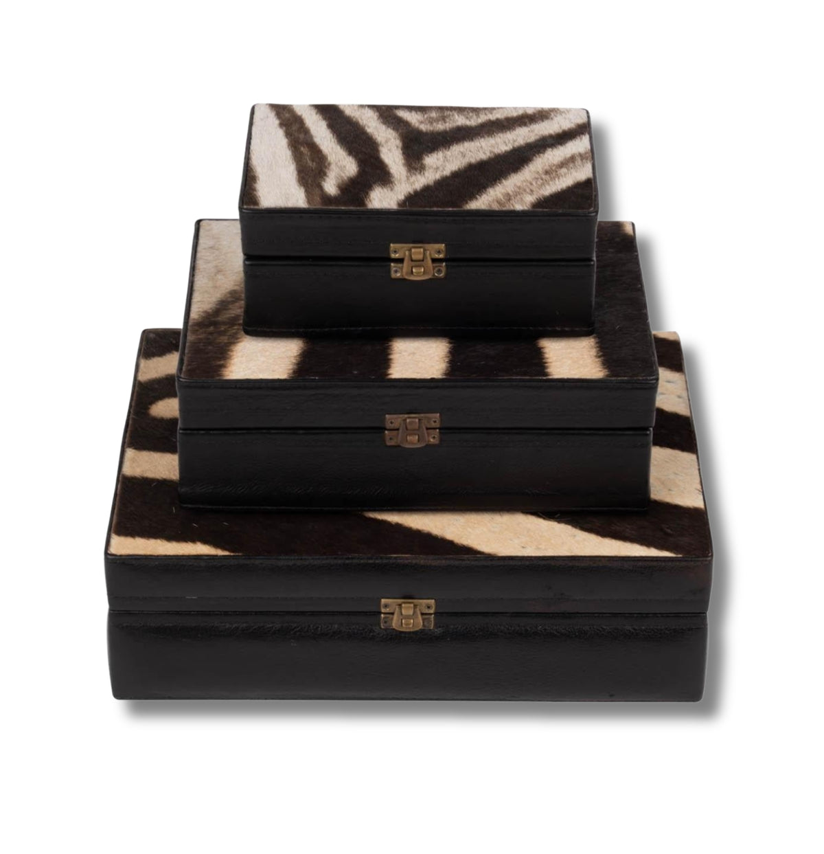 Expertly handcrafted from real zebra hide and distressed leather, this compact box brings a unique blend of style and practicality to any space. The blend of materials creates a one-of-a-kind appearance, perfect for storing cherished mementos or discreetly organizing belongings. Its small size adds a touch of exotic charm to any room, making it a must-have for those seeking to elevate their home decor with an air of sophistication.
